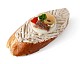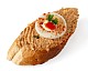 Pikanter Aufstrich aus geraspeltem Gouda und Meerrettich, garniert mit grüner Olive.